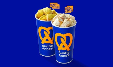 Auntie Anne’s® Hand-Rolled Soft PretzelsGet a blast of bold flavor with Flavor Blast Nuggets. Available in Sour Cream & Onion or Honey Mustard. Try it now!